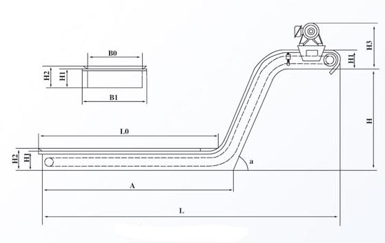1、根據安裝空間的大小確定磁性排屑機的高度H2(≥140mm),長度L0,